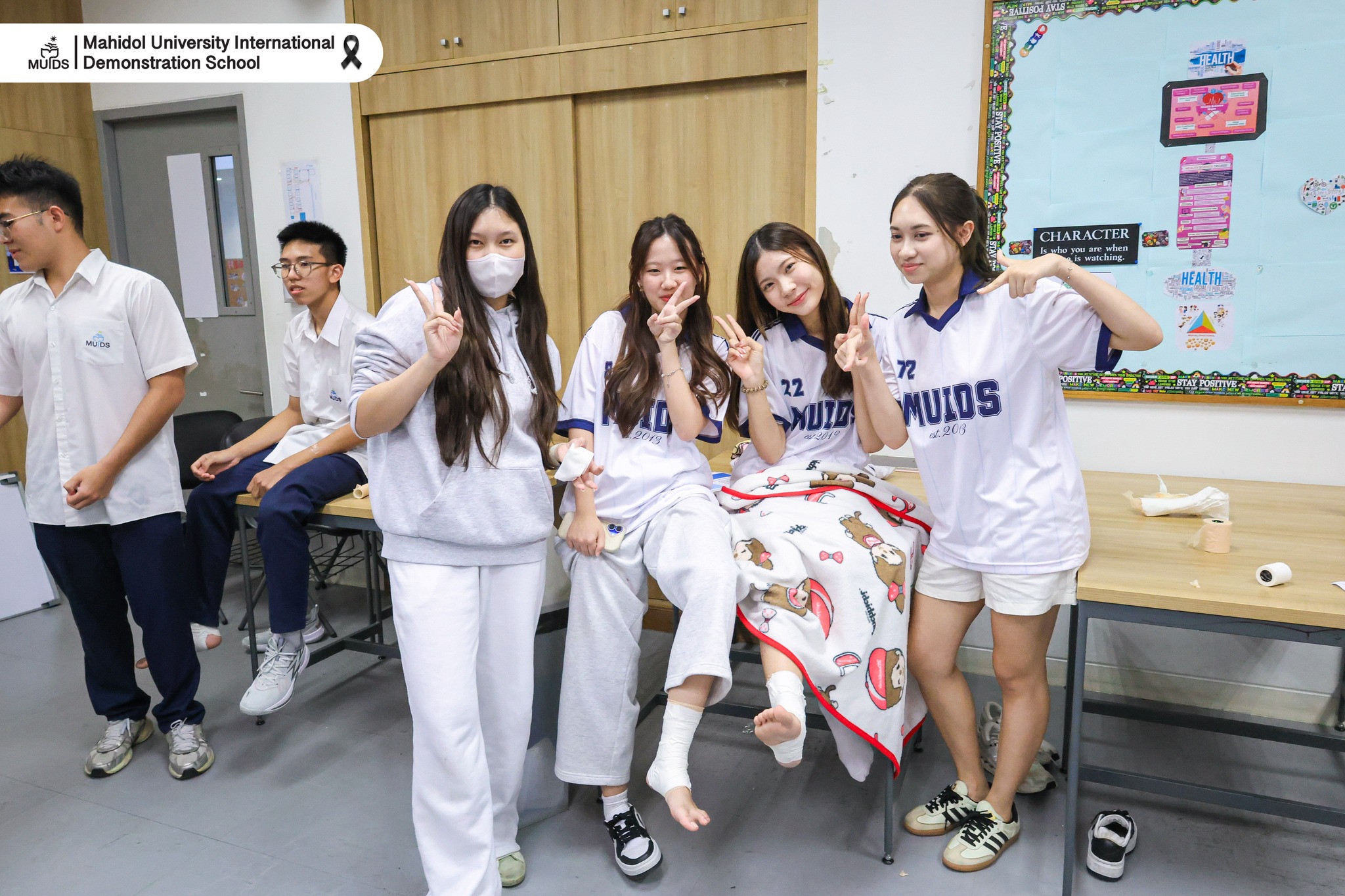 Grade 12 students at Mahidol University International Demonstration School (MUIDS) engaged in hands-on learning by practicing ankle taping techniques in their Applied Sports Science class