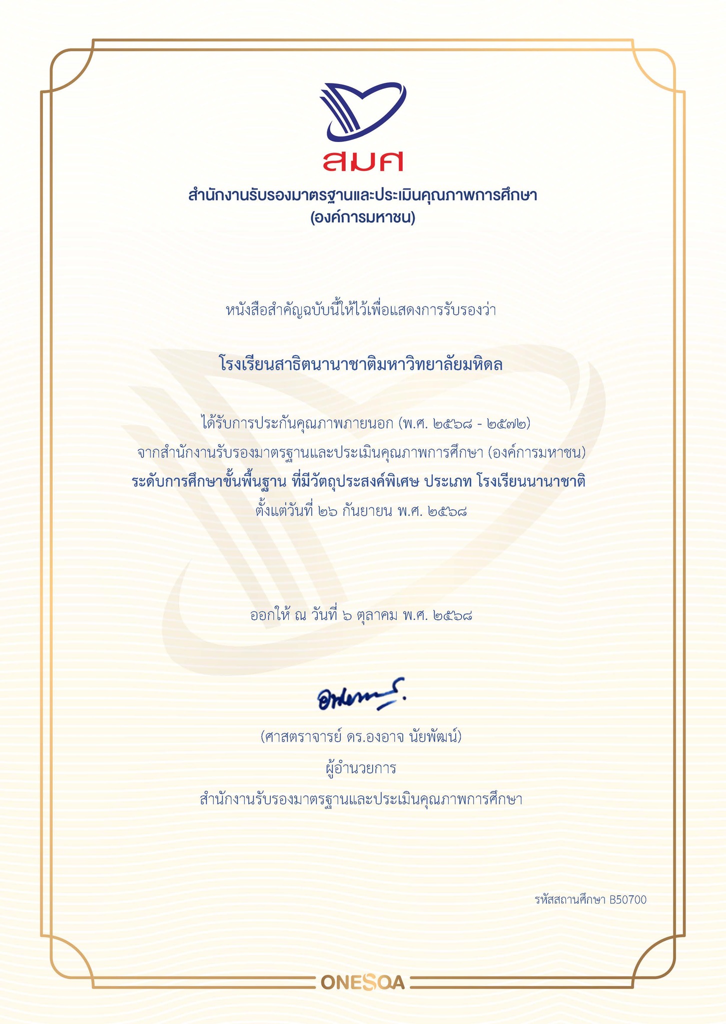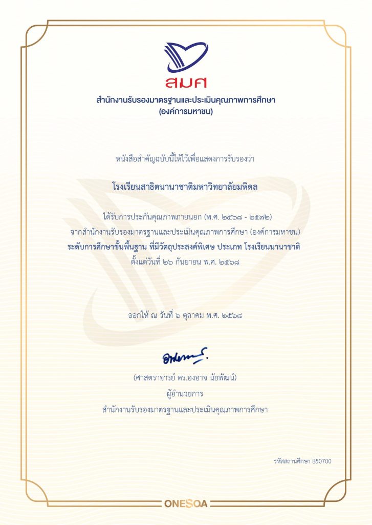 Mahidol University International Demonstration School (MUIDS) is proud to announce that we have been officially granted External Quality Assurance (EQA) for Academic Years 2025–2029 by the Office for National Education Standards and Quality Assessment (Public Organization) – ONESQA.