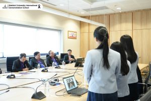 During the visit, MUIDS students Natcha Nitiwat, Pitcha Luengviriya, and Kornkamon Kiatsommart presented updates on their project progress and shared insights with the committees.