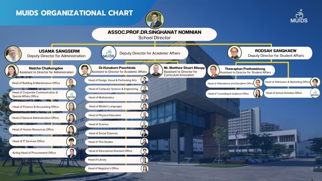 Organizational Chart Organizational Chart The MUIDS Organizational Chart shows the structure of roles and responsibilities at Mahidol University International Demonstration School, outlining key positions and reporting lines for efficient management.
