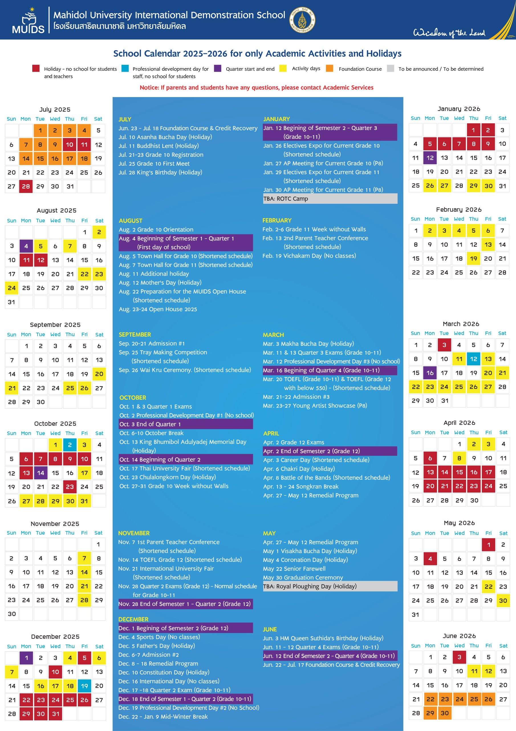 MUIDS Calendar MUIDS Calendar (2025-2026) MUIDS is an active community with a schedule of events suitable for all interests. Parents and guests are always welcome to attend. Scroll below and read about upcoming events and activities. Update : 1 December 2025